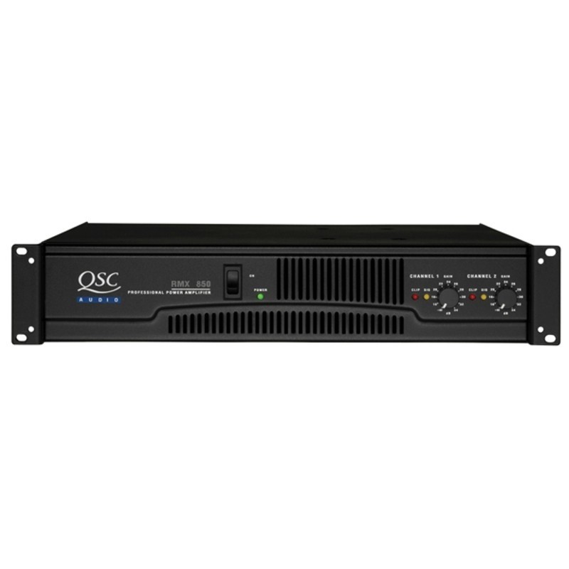 QSC RMX850HD amplificator audio. Putere: 2 x 300 W / 4 Ohmi, 2 x 200 W / 8 Ohmi, 2 x 430 W / 2 Ohmi, 1 x 600 W / 8 Ohmi (bridge), 1 x 830 W / 4 Ohmi (bridge). Conectori intrare: XLR si TRS (jack 1/4") balansate. Conectori iesire: borne si Neutrik Speakon. Dimensiuni (I x L x A): 89 (2U rack) x 483 x 400 mm. Greutate: 15.9 kg