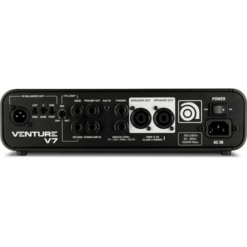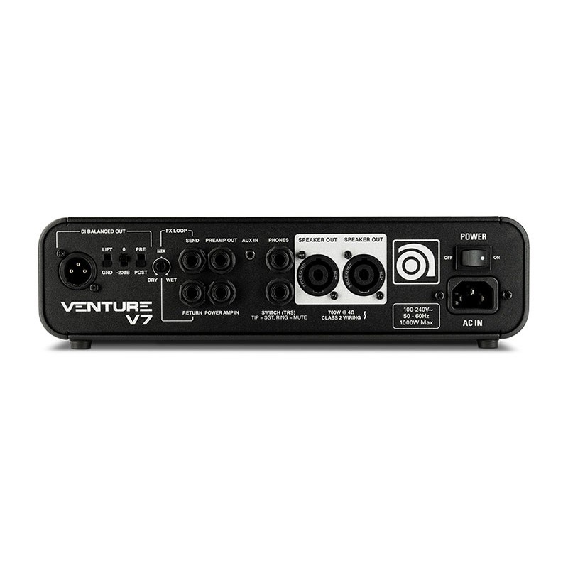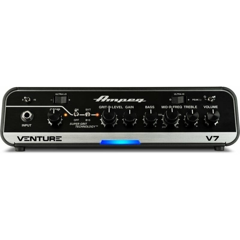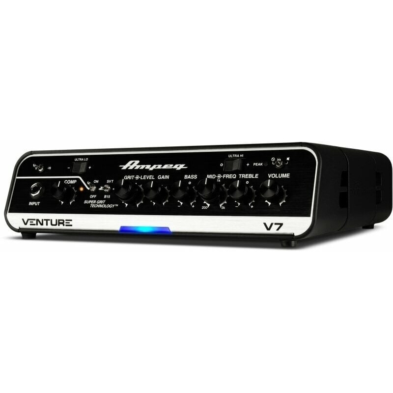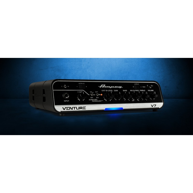 Ampeg Venture V7 este un head de bass cu o putere de 700W, echipat cu EQ cu 3 benzi, Sweepable Mids, switch-uri Ultra Hi/3-way Ultra Lo, circuit de overdrive SGT, compressor incorporat variabil si effects loop. Head-ul este potrabil, are dimensiuni compacte si este usor de utilizat.