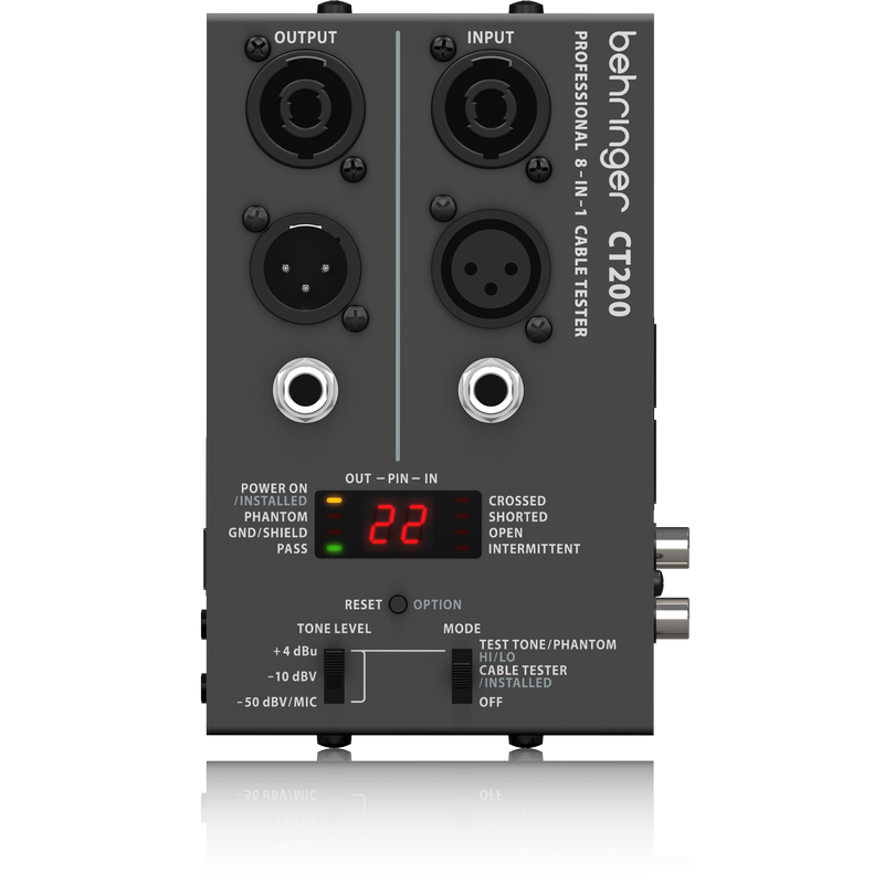 Testerul de cabluri CT200 accepta toata tipurile de cabluri pe care le-ai putea folosi insituatii de inregisrare studio sau concerte live: XLR, Speakon*, TRS (¼", 1⁄8"), RCA, RJ45, MIDI si USB. Poti alege dintre cele 3 modalitati de diagnoza: test cablu, testare cablu instalat sau ton. CT200 poate verifica continuitatea, intermitenta si scurtcircuitele. Poti lua testerul cu tine oriunde datorita dimensiunilr reduse si a bateriilor care ii ofera autonomie.