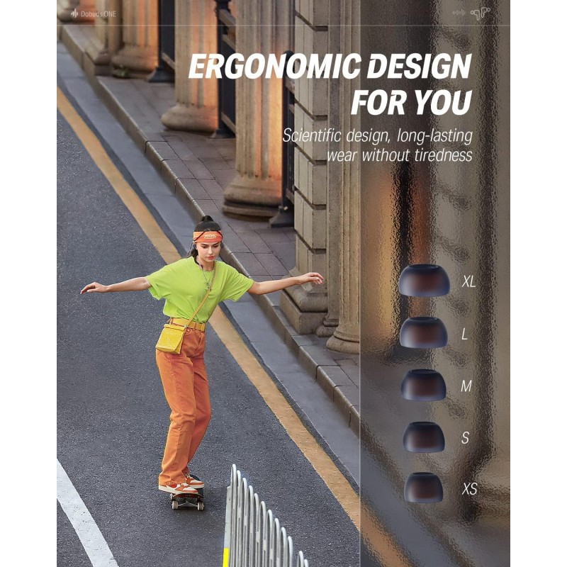 Sunt disponibile 5 dimensiuni diferite de dopuri pentru urechi (inclusiv XS, S, M, L și XL). Design științific cu dublă duritate, în două culori: stratul interior al mânecilor este strâns, în timp ce stratul exterior este moale pentru a se potrivi perfect canalului auditiv. Dopurile noastre pentru urechi vă vor oferi o experiență de purtare de lungă durată, fără oboseală. Designul confortabil și impermeabil IPX4 vă va ține departe de griji legate de burniță, ploaie sau transpirație. (Notă: Căștile sunt impermeabile, dar carcasa de încărcare nu este.)