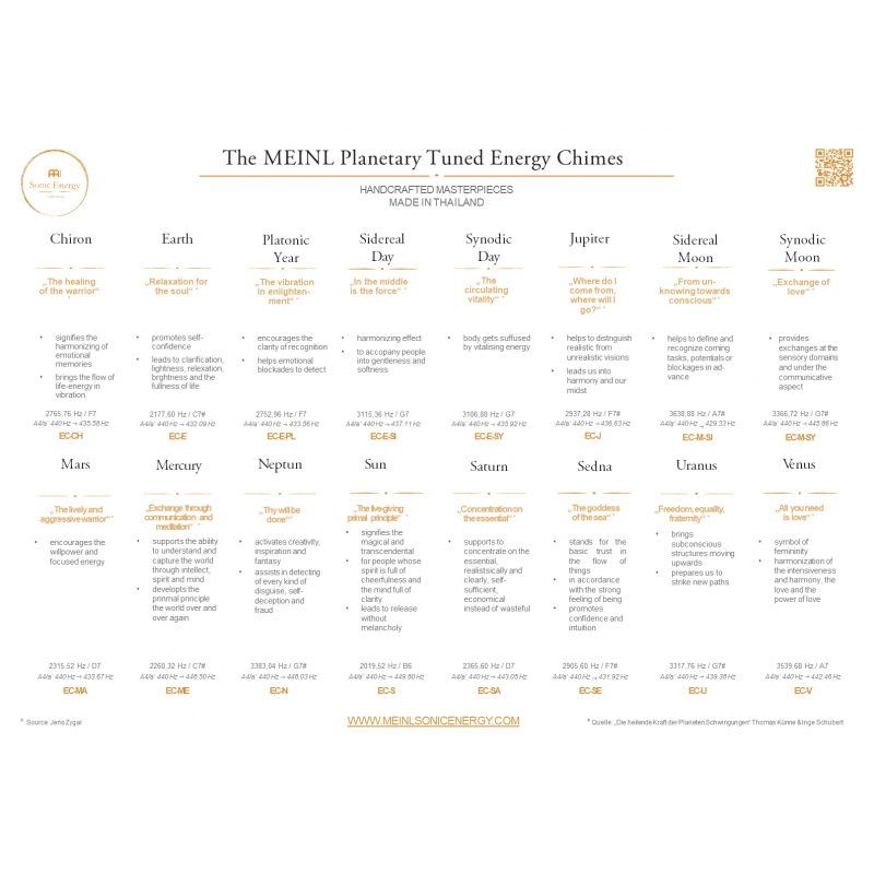 Clopoțeii energetici planetari Meinl Sonic Energy sunt creați folosind calculele lui Hans Cousto (Octava Cosmică) pentru a se potrivi cu frecvențele Soarelui, Lunii și planetelor. Fiecare clopoțel este acordat pentru a crea frecvența corespunzătoare corpului ceresc. Fabricați din aliaj de aluminiu anodizat cu argint pentru o frecvență exactă. Baza decorativă din lemn este finisată cu un logo gravat și un simbol de acordare, iar fiecare clopoțel vine cu un ciocan de lemn care produce o notă clară și definită pentru a umple cu ușurință spațiul (mic sau mare) cu un sunet liniștitor. Acest ciocan poate fi depozitat convenabil pe baza de lemn, așezându-l sub clopoțel. Acești clopoței energetici de înaltă calitate sunt ideali pentru scopuri terapeutice și meditative, dar pot fi utilizați și în sălile de clasă sau ca semnal sonor. Sfatul producătorului: Folosiți clopoțeii energetici planetari și în combinație cu diaporamele planetare asortate de la Meinl Sonic Energy.