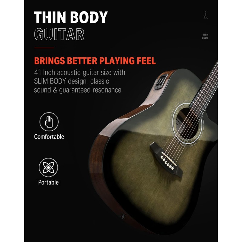 Această chitară de 41 de inci are un design cutaway, o curbă de capăt mai joasă care facilitează atingerea tastelor cu note mai înalte.