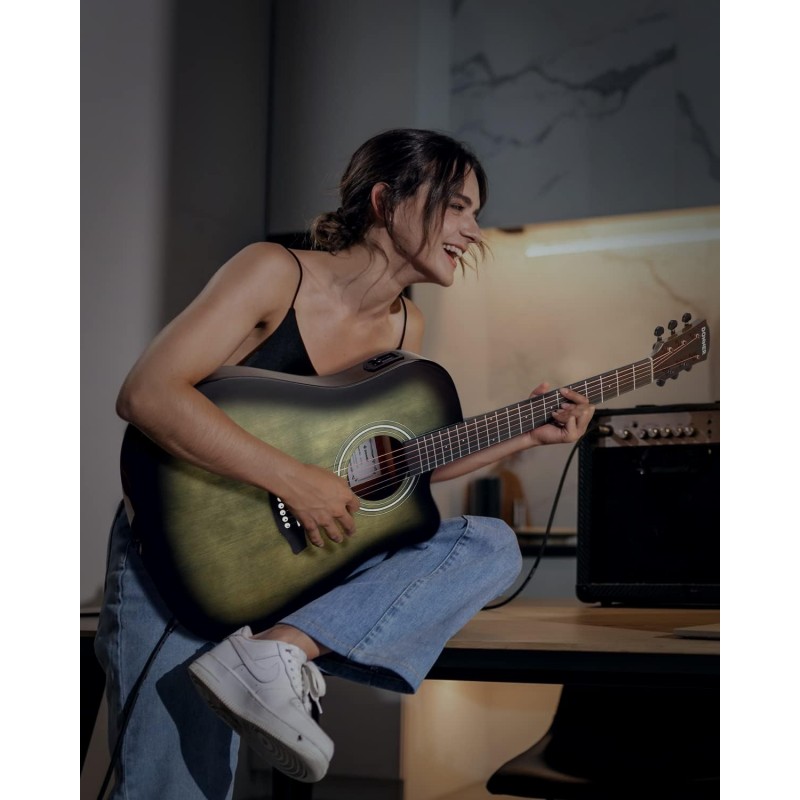 Acest model vine cu o pickup pasivă încorporată, astfel încât să o puteți cânta ca o chitară acustică obișnuită sau să o conectați la un amplificator. Are controale de ton și volum, astfel încât să puteți ajusta sunetul după preferințe.