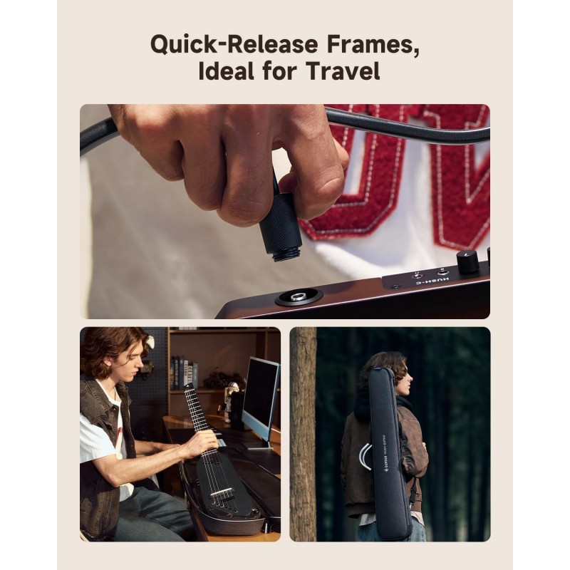 Ultraportabilă și gata de călătorie: Cu o greutate de doar 2,0 kg și un design compact, fără headstock, chitara clasică electroacustică HUSH™ C din nailon încape într-un rucsac pentru a asculta muzică oriunde. Perfectă pentru călătorii, naveta sau sesiuni de improvizație liniștite - trebuie doar să conectați căștile și să cântați oriunde.