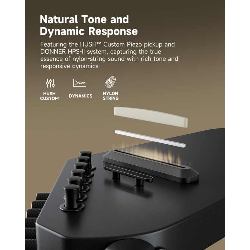Exersare cu căști, sunet clasic natural: Sistemele HUSH Custom Piezo și HPS-II oferă un sunet natural al corzilor de nailon, fără feedback. Cântați în liniște prin căști sau conectați-vă pentru un ton cristalin pe scenă - ideal atât pentru repetiții liniștite, cât și pentru spectacole live.