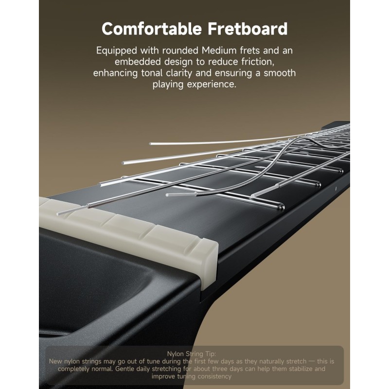 Meșteșugul Premium Întâlnește Estetica Modernă: Fabricată din lemn de okoume, un design cu gât transversal și un gât ranforsat cu fibră de carbon, chitara electrică acustică HUSH™ C din nailon oferă o rezonanță bogată și o stabilitate de durată. O piuliță din os natural, inlay-uri din abalon și o tijă de susținere cu role fără unelte adaugă un ton și confort de nivel profesional.