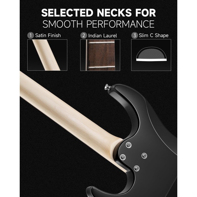 Proiectată cu un gât subțire în formă de C, optimizat pentru o interpretare rapidă și confortabilă, combinată cu contururi atent elaborate, asigurând o experiență lină și fără oboseală atât pentru începători, cât și pentru muzicienii avansați.