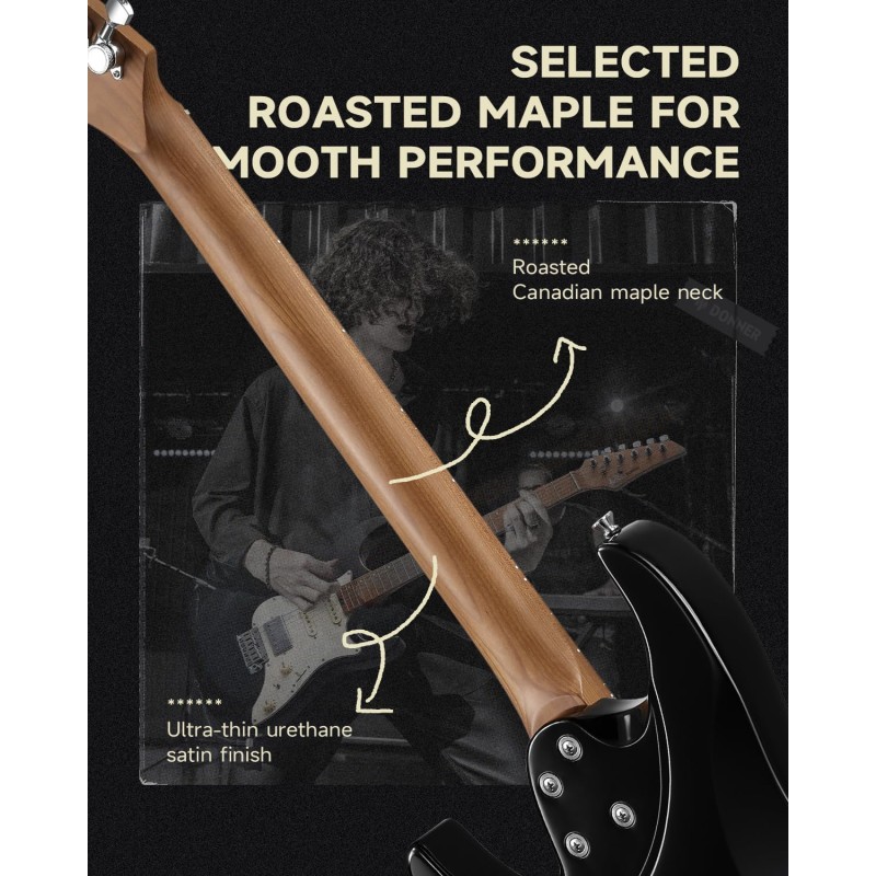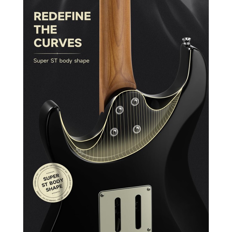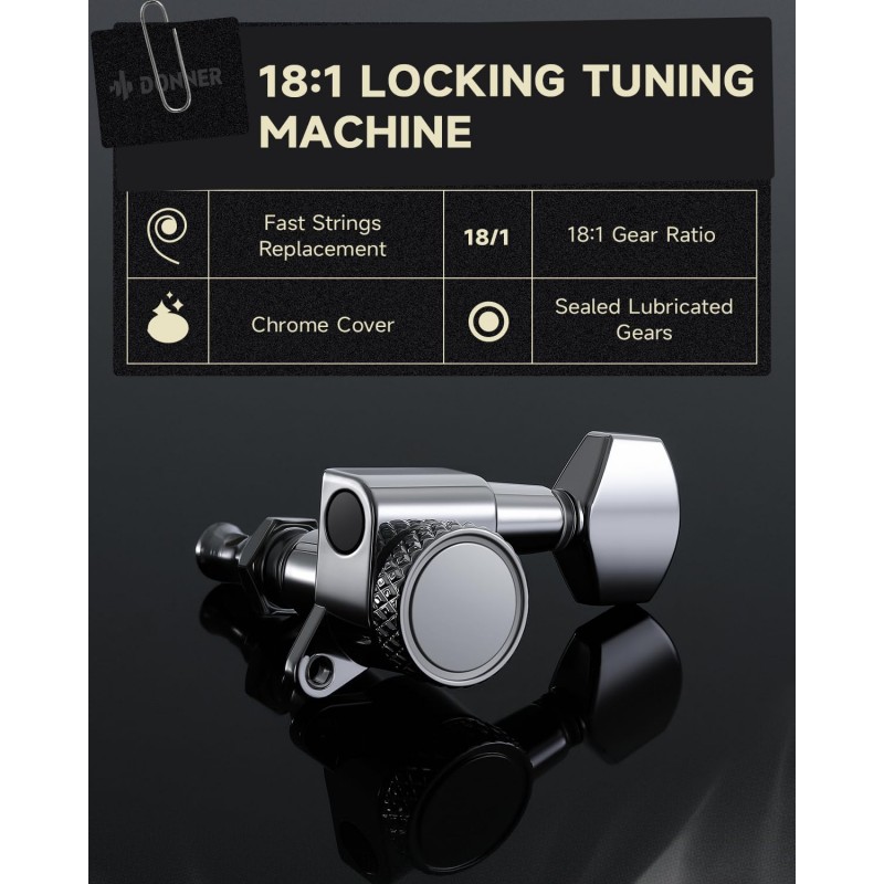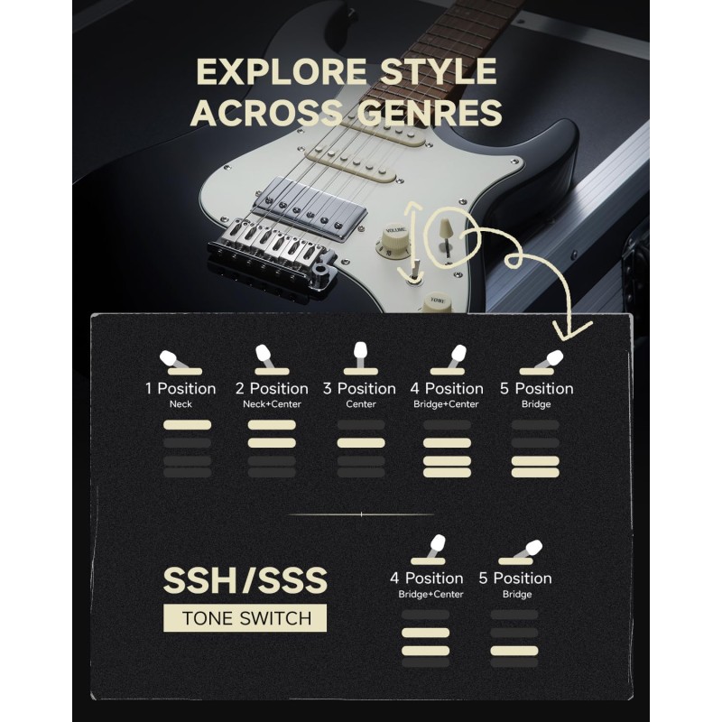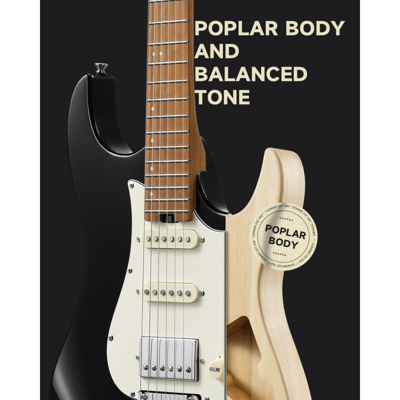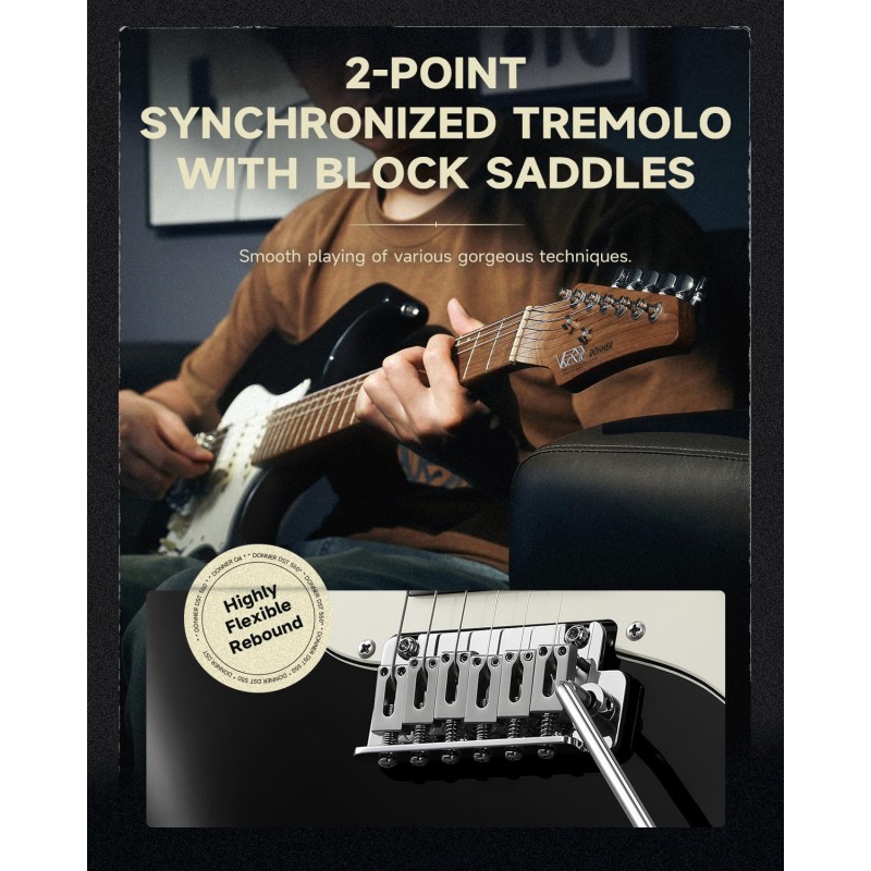 Sistem de selecție a 7 tonurilor cu doze ThunderForge: Un comutator independent permite accesul facil la opțiunile de 7 tonuri. În modul single-coil, oferă un sunet clasic cu o claritate excepțională. DST-550 dispune de dozele ThunderForge de la DONNER, cu un humbucker comutabil și două bobine simple. De asemenea, include un tremolo cu blocare în două puncte pentru o redare versatilă, trecând fără probleme de la blues-ul clasic la cel modern cu gain ridicat.