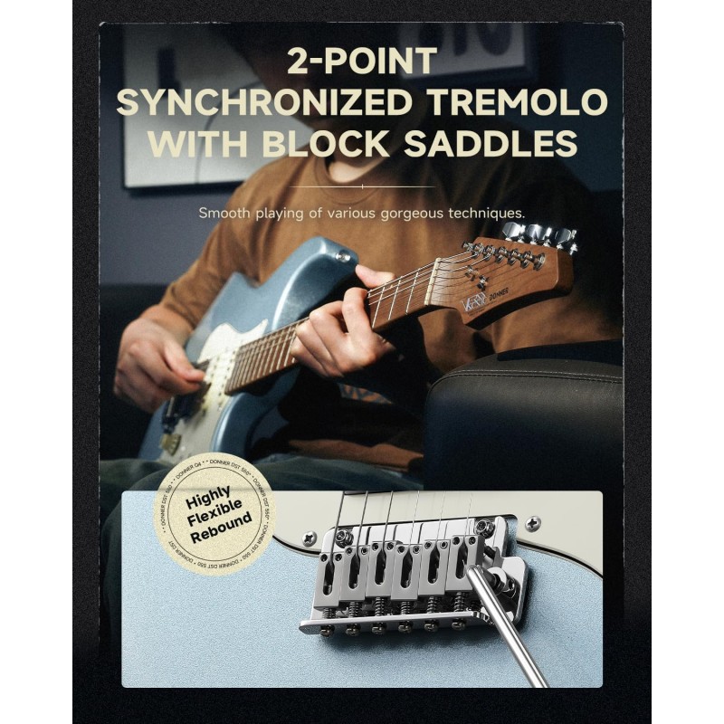 Sistem de selecție a 7 tonurilor cu doze ThunderForge: Un comutator independent permite accesul facil la opțiunile de 7 tonuri. În modul single-coil, oferă un sunet clasic cu o claritate excepțională. DST-550 dispune de dozele ThunderForge de la DONNER, cu un humbucker comutabil și două bobine simple. De asemenea, include un tremolo cu blocare în două puncte pentru o redare versatilă, trecând fără probleme de la blues-ul clasic la cel modern cu gain ridicat.