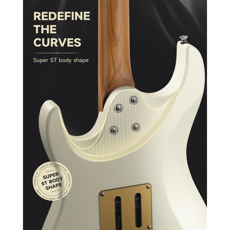 Corp din plop premium cu confort sporit: Fabricat din plop învechit, cu un control strict al umidității pentru stabilitate, DST-550 prezintă un design unic cu tăiere dublă, care îmbunătățește bogăția tonală pe toate frecvențele. Acest contur special al corpului îmbunătățește calitatea sunetului și sporește confortul chitaristului, permițând o redare fără efort și asigurând lipsa disconfortului în timpul sesiunilor lungi.