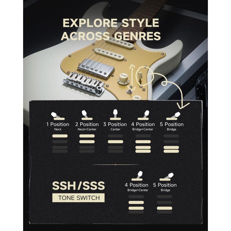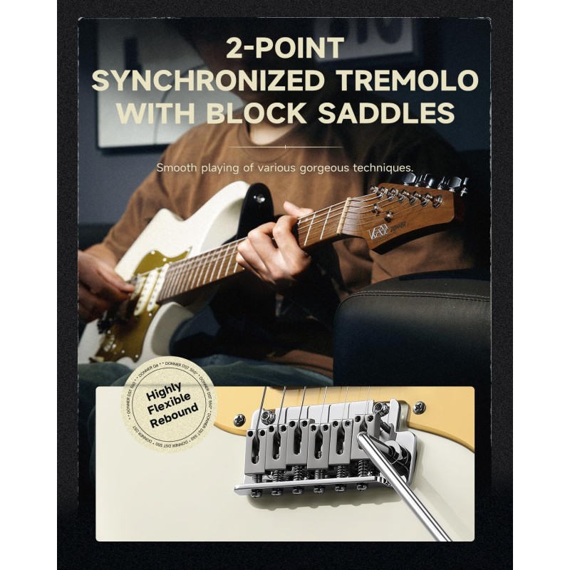 Sistem de selecție a 7 tonurilor cu doze ThunderForge: Un comutator independent permite accesul facil la opțiunile de 7 tonuri. În modul single-coil, oferă un sunet clasic cu o claritate excepțională. DST-550 dispune de dozele ThunderForge de la DONNER, cu un humbucker comutabil și două bobine simple. De asemenea, include un tremolo cu blocare în două puncte pentru o redare versatilă, trecând fără probleme de la blues-ul clasic la cel modern cu gain ridicat.