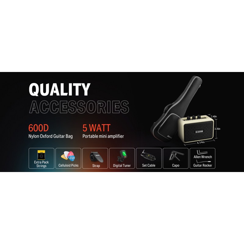 Pachet complet de accesorii: Vine cu o husă de concert, căști, cablu USB-C, cablu pentru instrument de 1/4”, curea, pene și instrumente esențiale - gata de cântat imediat ce ați scos-o din cutie.