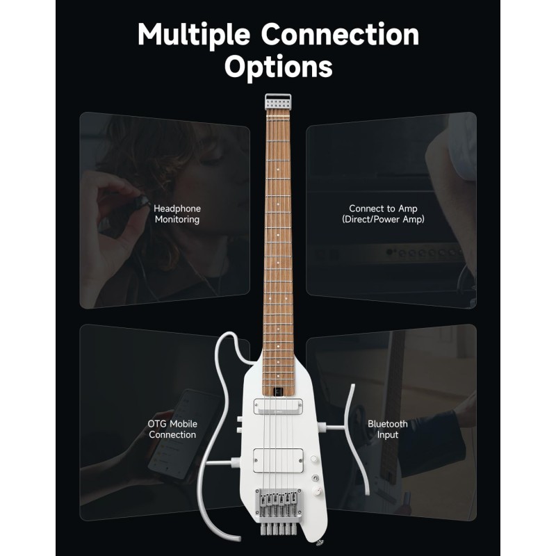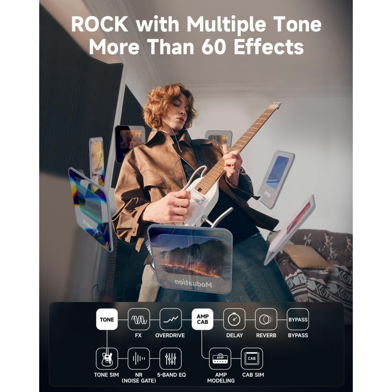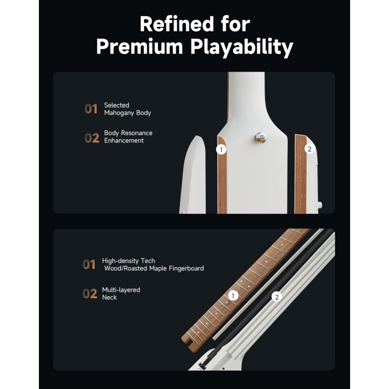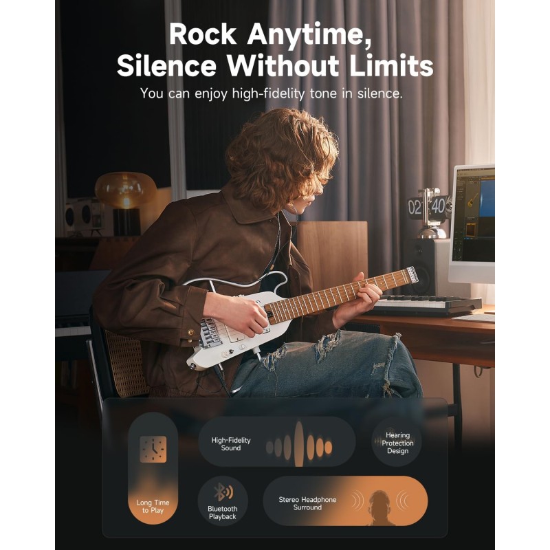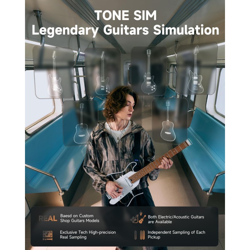 Simulatoare de tonuri - Cu 4 tonuri de chitară electrică și 3 tonuri de chitară acustică eșantionate de la chitare personalizate, HUSH X PRO oferă 7 simulări distincte de tonuri. Chitara portabilă combină perfect tonurile unice ale mai multor chitare cu efecte versatile, oferind o diversitate muzicală și o comoditate de neegalat.