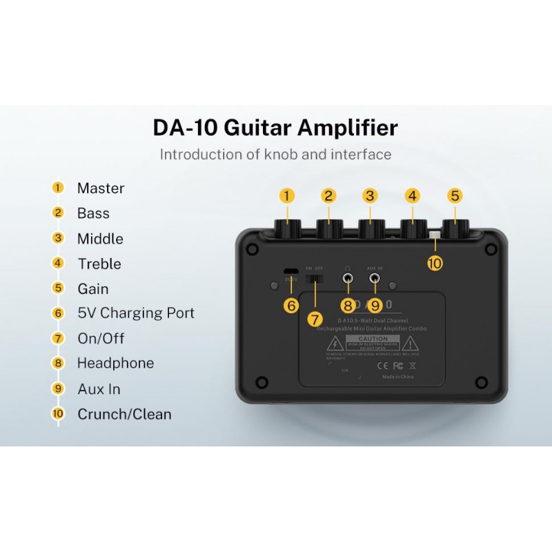 DA-10 poate reda până la patru ore la o putere maximă de 5 wați. Chiar și așa, designul său mic îl face ușor de manevrat cu o singură mână. Puteți merge oriunde cu acest mini amplificator, trebuie doar să îl conectați și să îl utilizați. Deoarece curentul de intrare în amplificator în timpul încărcării poate să nu fie suficient pentru a compensa puterea consumată de amplificatorul în sine, vă recomandăm să încărcați amplificatorul timp de aproximativ 10 minute înainte de a-l utiliza atunci când bateria este complet descărcată.