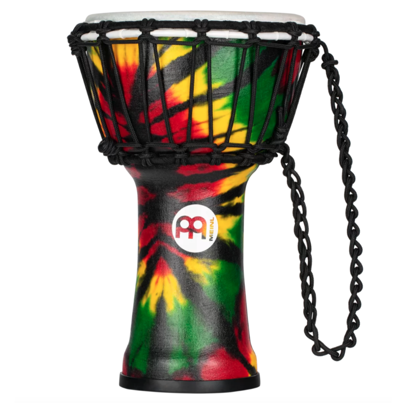 Meinl Synthetic Djembe 7'' Tie Dye JRD-TD - Portabil, cu un sunet "mare" și o carcasă sintetică ușoară, MEINL JR. Djembe este instrumentul perfect pentru a fi luat și dus oriunde este nevoie. De la întâlniri în aer liber cu prietenii la jam session-uri spontane sau la a-i învăța pe alții despre ritm, aceste djembe compact este ideal. Membrana sintetică este fixată cu frânghii pre-tensionate pentru a menține mai bine acordajul. Ideal pentru orice vârstă sau nivel de îndemânare.