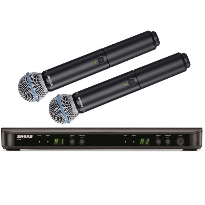 Pachetul include: receiver BLX88 cu 2 canale wireless, 2 microfoane BLX2 dinamice cu capsula supercardioid Beta 58A® wireless SM58, 2 clipsuri pentru fixare in stativ, alimentator.