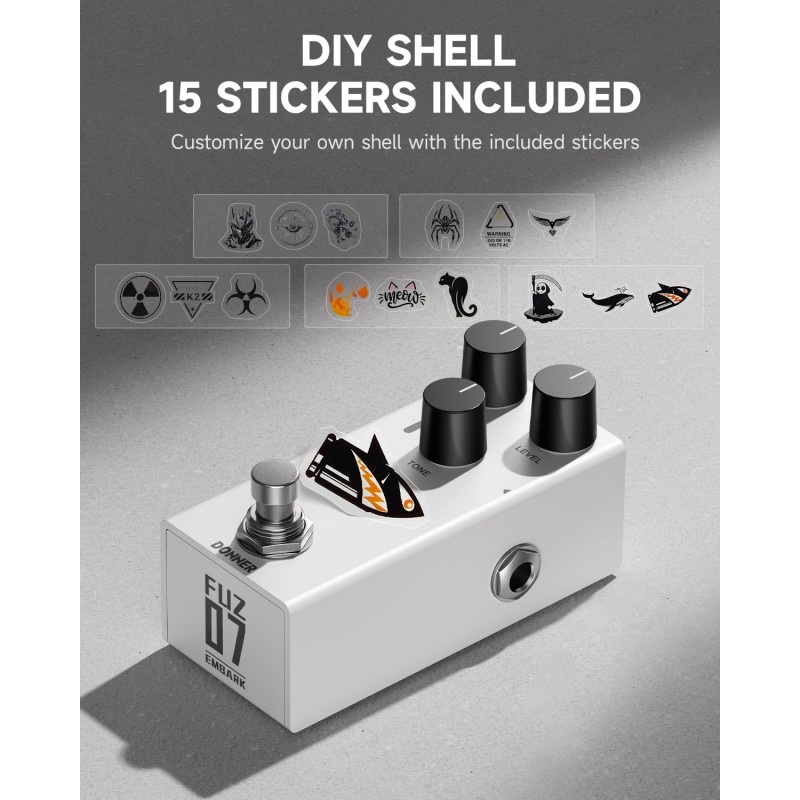 Cu autocolantele incluse sau alte decorațiuni pe care le aveți deja, vă puteți exprima liber creativitatea și vă puteți exersa imaginația, personalizând propria carcasă a pedalei de chitară.