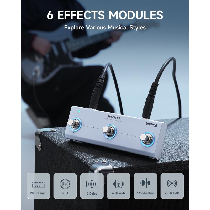 - Include 6 module de efecte, 20 de amperi, egalizator, modulație, delay și reverb - perfect pentru a crea orice ton.