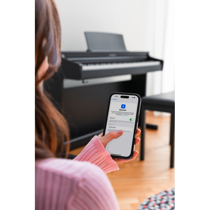 CX202 combină atingerea expresivă și sunetul puternic pentru pianiștii aspiranți. Acțiunea sa Responsive Hammer Compact II (RHCII) cu un sistem cu 3 senzori asigură o redare precisă și autentică, în timp ce tehnologia Harmonic Imaging™ oferă tonul bogat al pianului de concert Shigeru Kawai SK-EX. Un sistem de difuzoare stereo de 40 W, conectivitatea Bluetooth® MIDI/Audio și finisajele elegante ale carcasei fac din CX202 o alegere versatilă și rafinată pentru acasă.