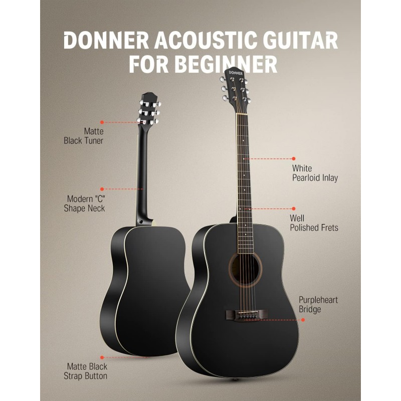 Pachetul de chitară acustică Donner include chitară, husă căptușită, curea, tuner digital cu clips, capo, pickguard, pachet suplimentar de corzi, 4 Pene, o cârpă curatat și o cheie Allen.
