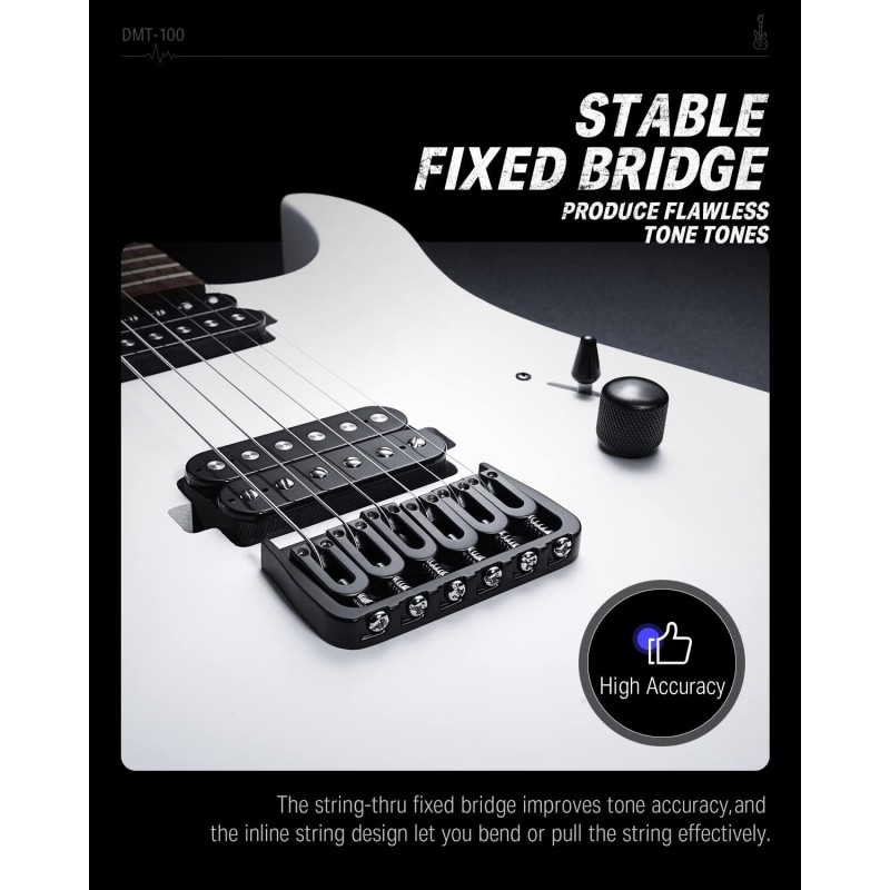 Calus fix cu finisaj mat: Bridge-ul fix îmbunătățește precizia tonului, iar designul corzilor în linie vă permite să îndoiți sau să trageți eficient de coardă, permițând chitarei electrice Donner cu corp solid să producă tonuri impecabile în orice poziție.