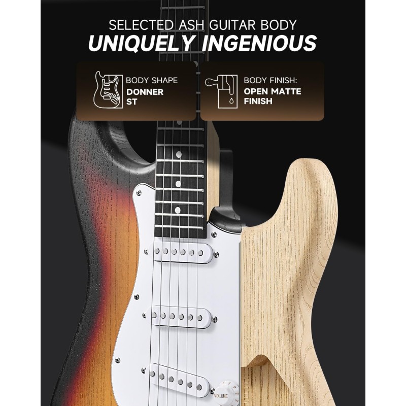 PACHET COMPLET PENTRU ÎNCEPĂTORI: Deschideți cutia și sunteți gata de cantat. Acest kit pentru începători include chitara electrică DST-80, amplificator de 5W, husă de rezistenta, capo, curea, corzi suplimentare, tuner digital, cablu amplificator, pene și acces la lecții online gratuite de la Donner pentru a te ajuta să crești și să strălucești.