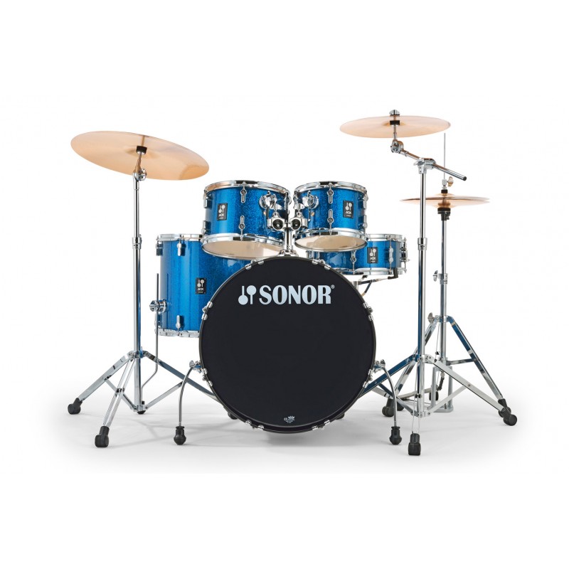 Sonor AQX Stage Kit Blue Ocean Sparkle - Set de tobe acustice din 5 piese în configurație standard cu hardware cromat, shell-uri din lemn de plop, fețe pentru toba mare presurdinate, șuruburi de acordaj AQ cu sistem ”TuneSafe” și cinele fabricate din B8 Bronze.