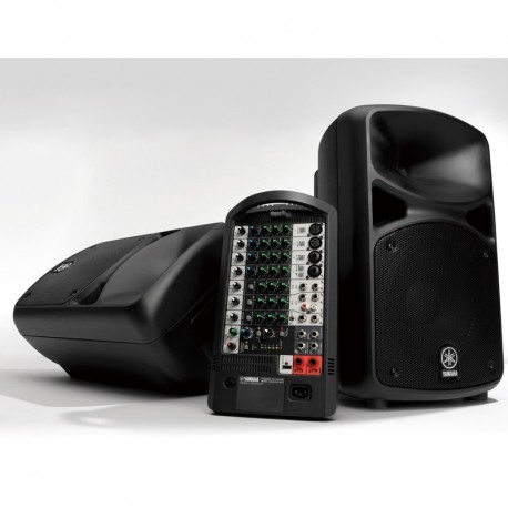 YAMAHA STAGEPAS 600i sistem PA. Sistemul include mixer cu amplificator 2 x 340W, cu 10 canale si efecte de reverb, doua boxe de cate 340 W echipate cu difuzoare de 10" si drivere de 1.4", cabluri pentru boxe si doua pad-uri anti-derapante. Conexiune USB pentru iPhone/iPad. Banda de frecvente: 55 Hz - 20 kHz. Greutate: 25.4 kg.