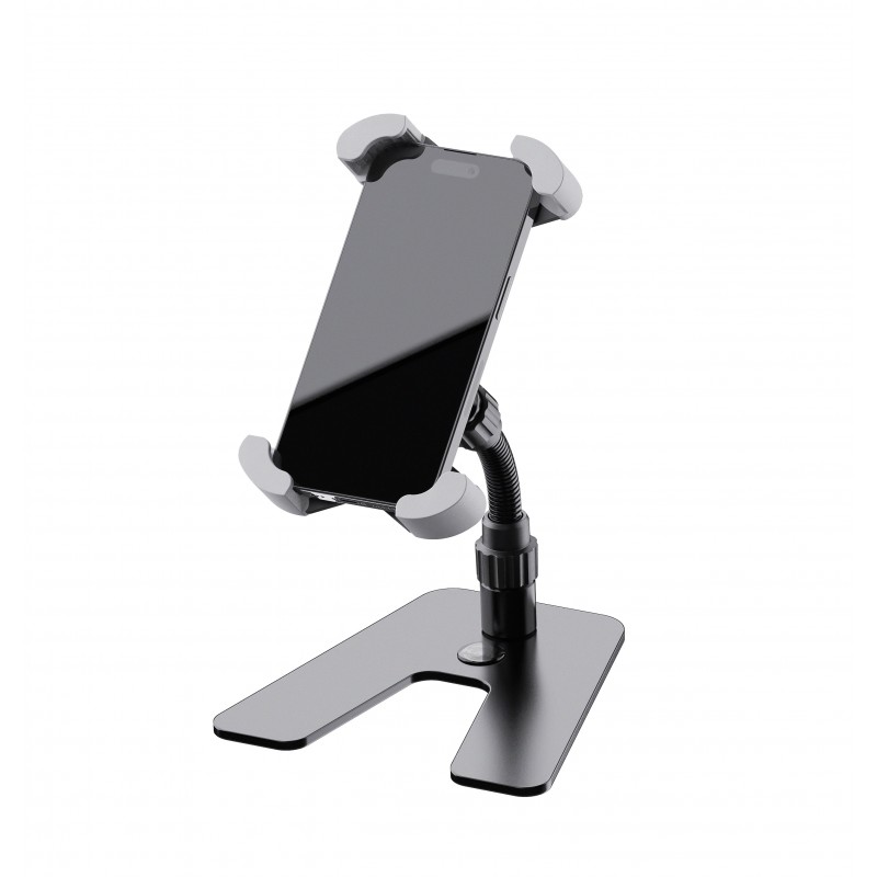 Un buton de eliberare rapidă de pe spate cu mecanism de blocare deblochează clemele cauciucate, iar smartphone-ul poate fi îndepărtat cu ușurință. Datorită articulației sferice flexibile, suportul poate fi înclinat în sus și în jos și rotit la 360°. Brațul de sprijin flexibil cu o lungime de 100 mm oferă o poziționare individuală suplimentară. O bază metalică atractivă cu tampoane de cauciuc antiderapante asigură o stabilitate excelentă