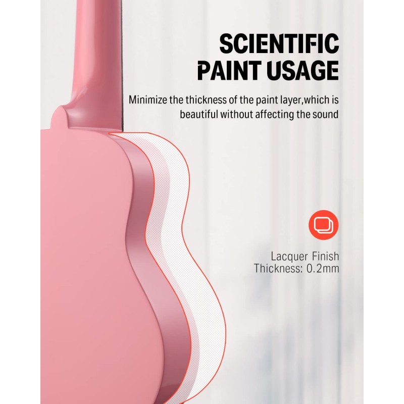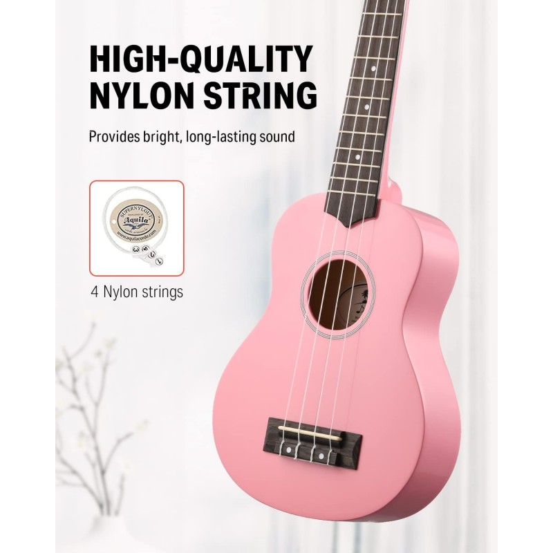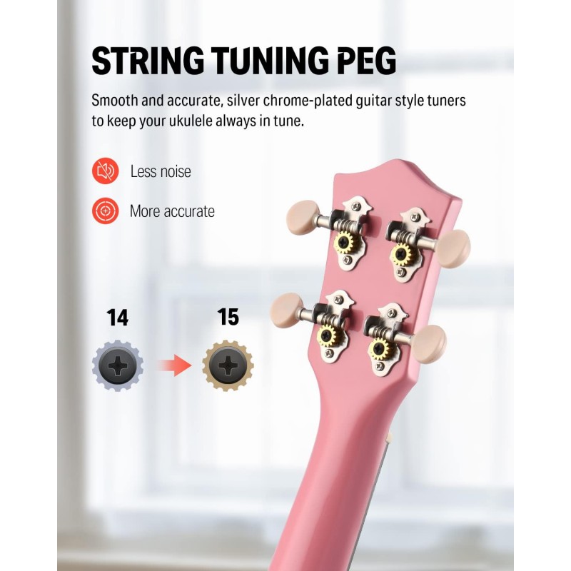 ♫ Sunet Cald și Bogat: Ukulele soprano cu corp din arțar bine construit are un sunet dulce, strălucitor și cald și durează mult timp. Tunerele de chitară placate cu crom argintiu mențin ukulele-ul mereu în acord și cu o intonație precisă. 12 Taste din alamă cu marcaje de poziție a tastelor la tastele 5, 7, 10 pe gât și partea superioară a tastei.